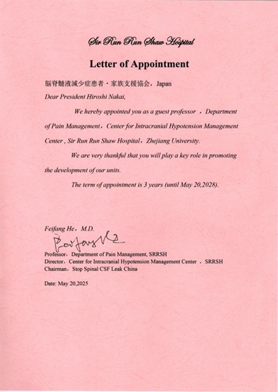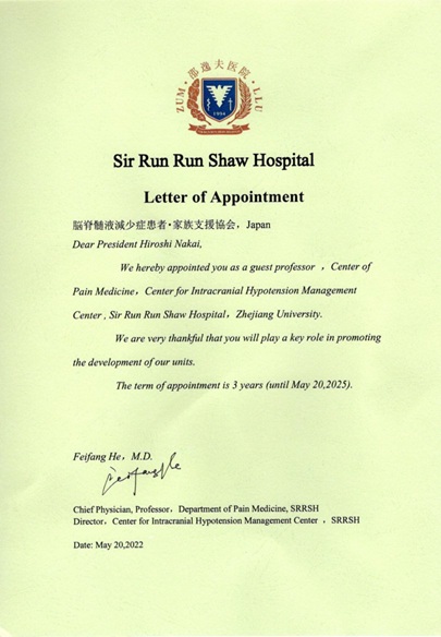 浙江大学医学部麻酔科疼痛センター脳脊髄液減少症マネージメント客員教授の任命 2028年5月20日まで