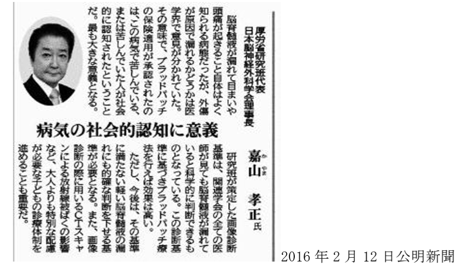 A) 2016年 嘉山厚労省脳脊髄液減少症研究班主任研究者の記事