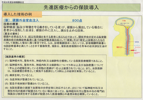 厚生労働相の諮問機関「中央社会保険医療協議会」(中医協)は、脳脊髄液が漏れて頭痛などの症状が現れる脳脊髄液減少症に有効なブラッドパッチ療法(硬膜外自家血注入療法)について、先進医療会議の検討結果を受け、保険適用を承認した。2月中旬の答申で正式決定しました。